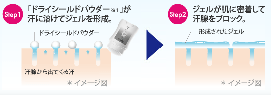 ・パウダーが汗と混じってジェルとなり、汗腺に蓋をする