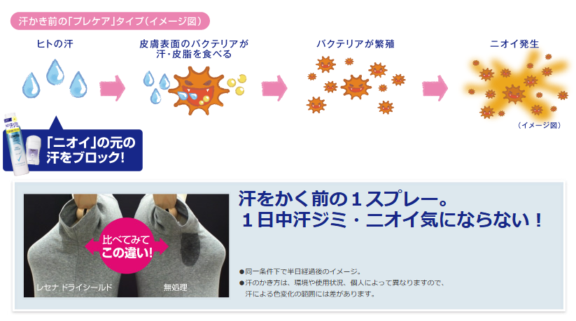 「レセナ ドライシールド」は、ニオイの原因となる“汗”を制汗有効成分「ドライシールドパウダー」※1で効果的に抑えます。